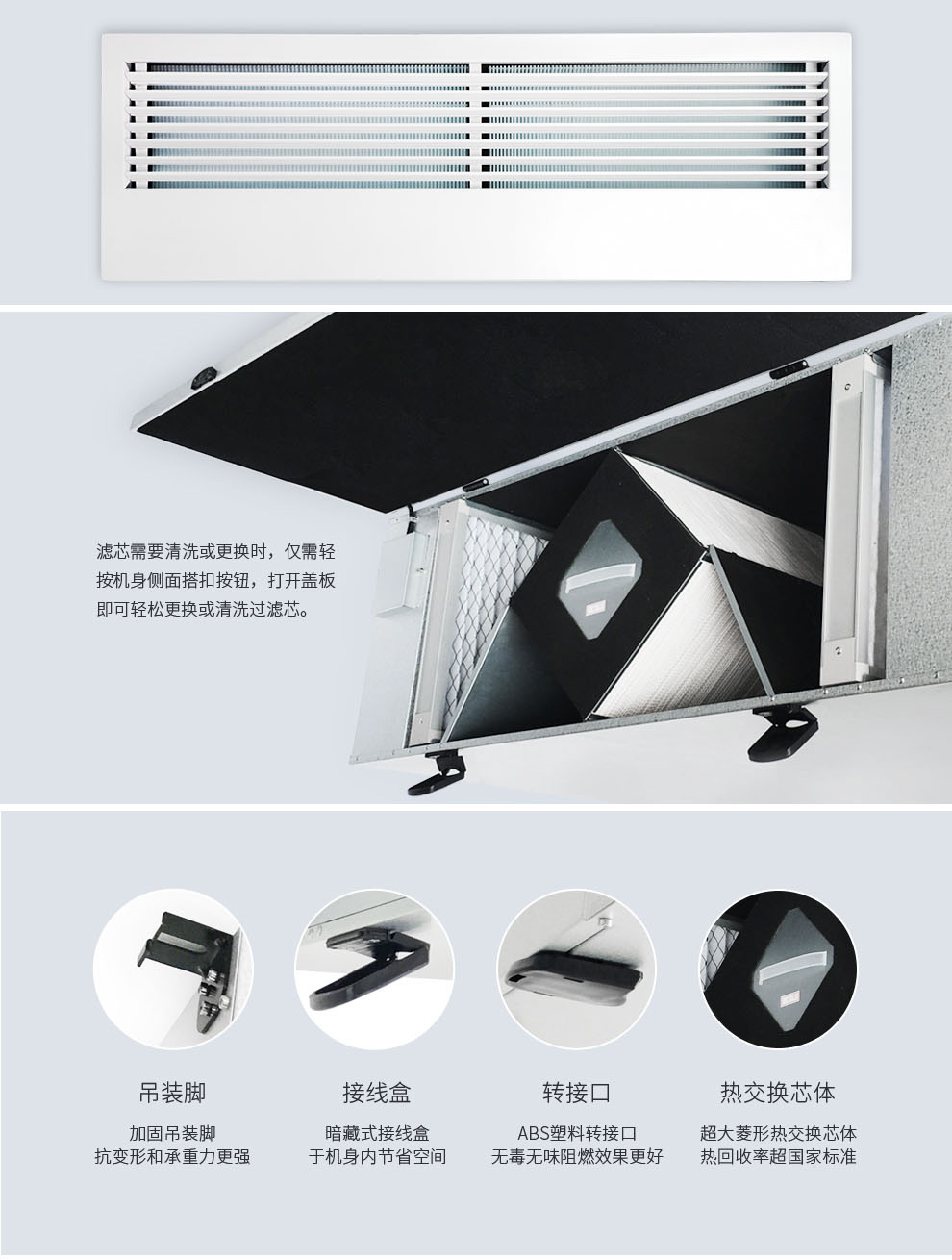 双向冷热交换能量回收技术,整机热交换效率高,均超过国家标准,高效换气率,保证内部结构不窜风。